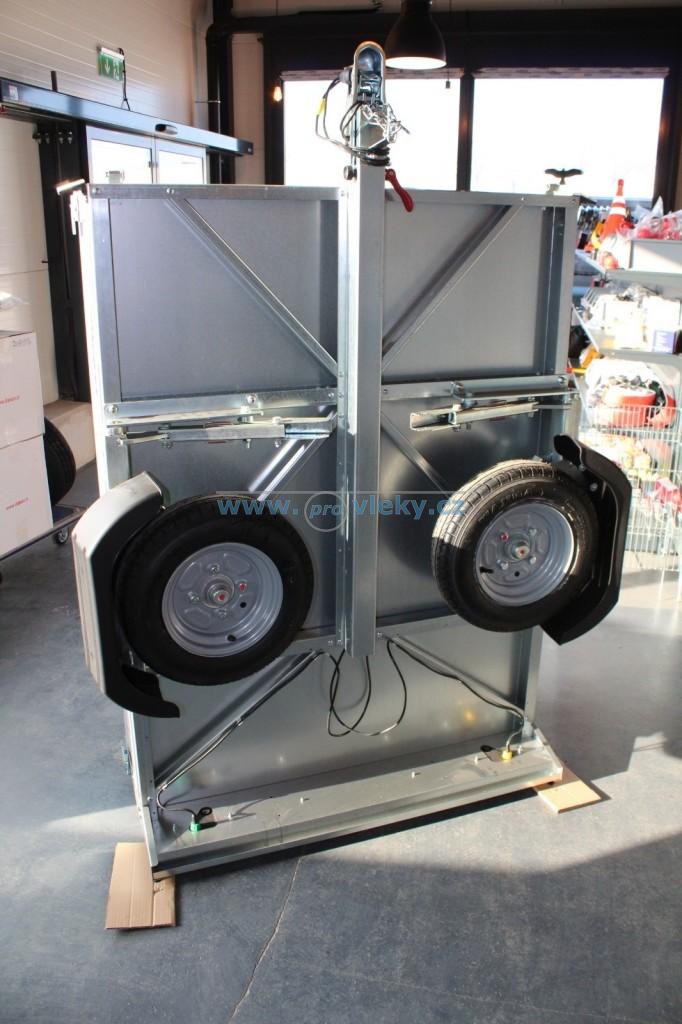 Díky chytrému mechanismu složíte přívěs během 2 minut a uložíte jej na výšku ke zdi v garáži, sklepě nebo přístřešku.